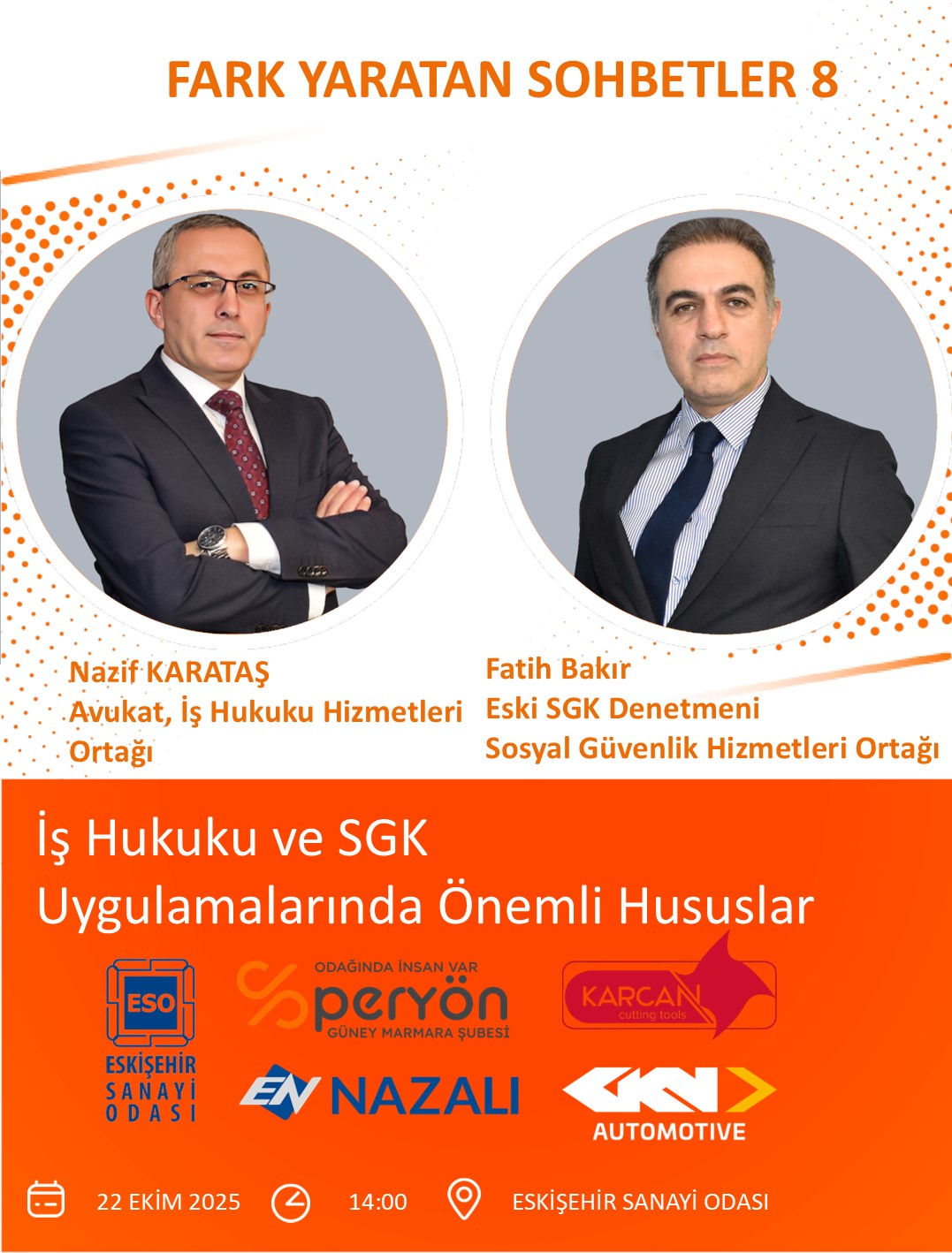 Eskişehir Sanayi Odası’nın desteklediği “Fark Yaratan Sohbetler – 8” programı kapsamında, iş dünyasının önemli bir gündem maddesi olan “İş Hukuku ve SGK Uygulamalarında Önemli Hususlar” konulu söyleşi düzenlenecektir.