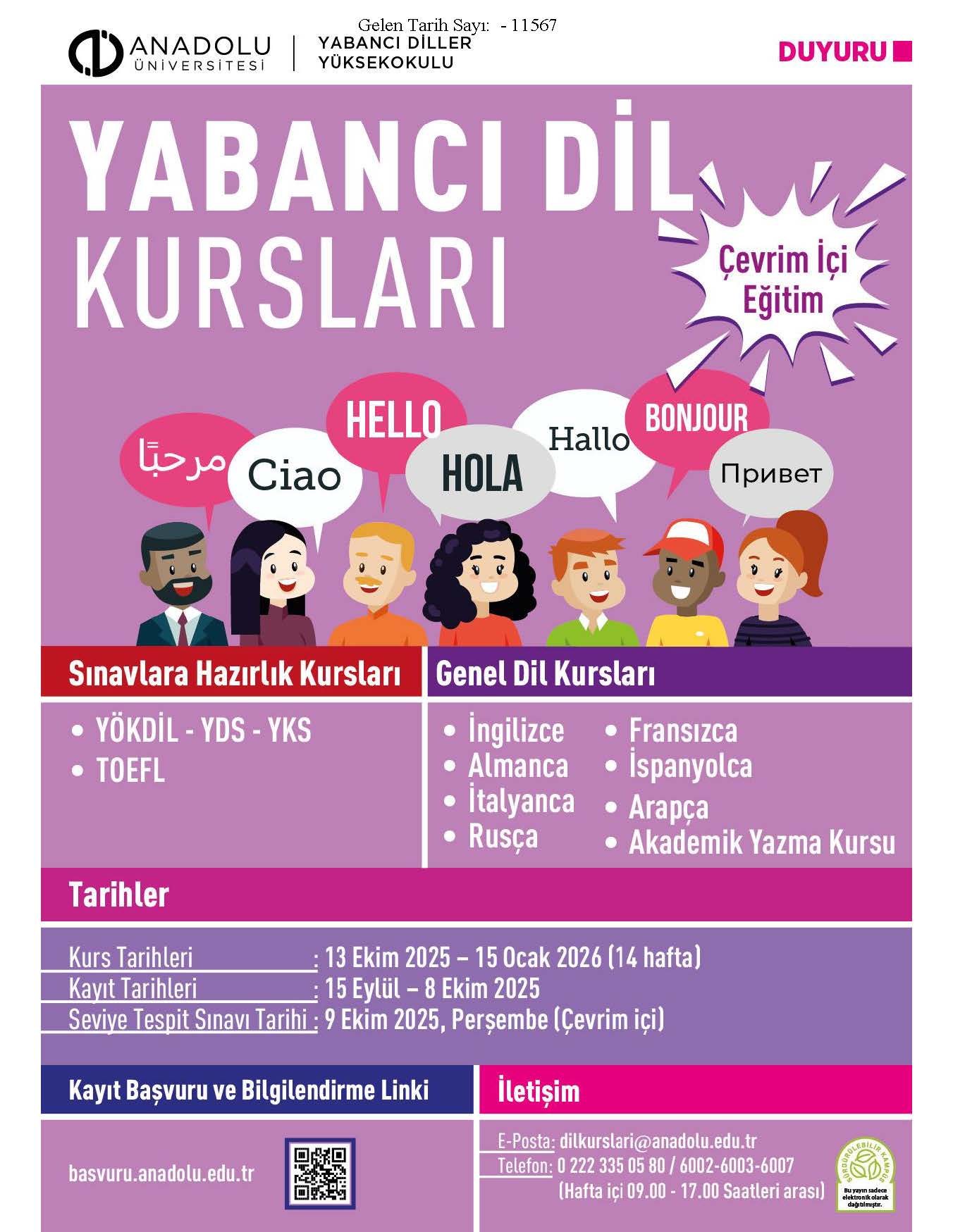 Anadolu Üniversitesi Yabancı Diller Yüksekokulu tarafından yüz yüze ve çevrim içi olarak açılması planlanan Yabancı Dil Kursları ile ilgili dijital afiş ekte yer almaktadır.